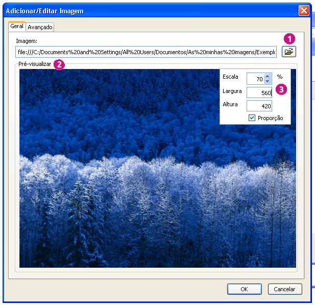Surge a janela GERAL que permite procurar a imagem nas pastas . Logo que seleccionada uma imagem, esta surge na secção Pré-visualizar . É ainda possível escalar a imagem ou definir a largura e altura exactas pretendidas . Pode ainda escolher manter a proporção original, quando definido um dos elementos (largura ou altura).