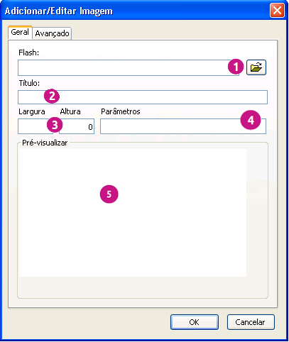Para adicionar um elemento Flash, a pesquisa processa-se da mesma maneira  que nos exemplos anteriores. É possível acrescentar um título  - que será apresentado quando o cursor passar sobre o link – e ainda definir a largura e a altura , bem como os parâmetros do flash (por exemplo, se tem autoplay, fundo transparente ou opaco, se entra em loop infinito...).